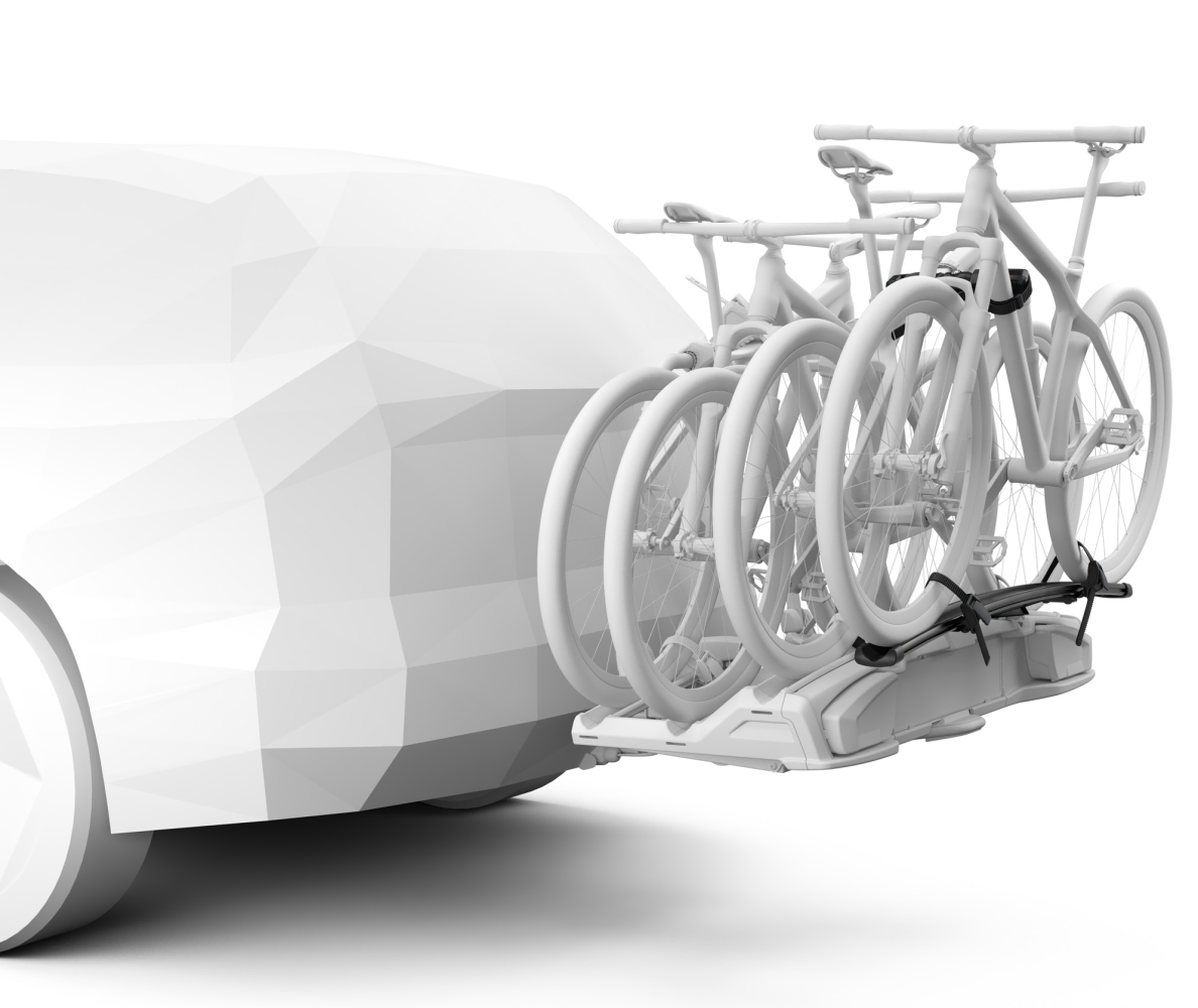 The Additional Bike Adapter fits frame dimensions in the range 20-90 mm and can load bikes with a max wheelbase of 1200 mm and max tire width of 3" or up to 4.7" with the Thule extra long wheel straps. When fitted the distance between the outer two bikes is 17 cm.