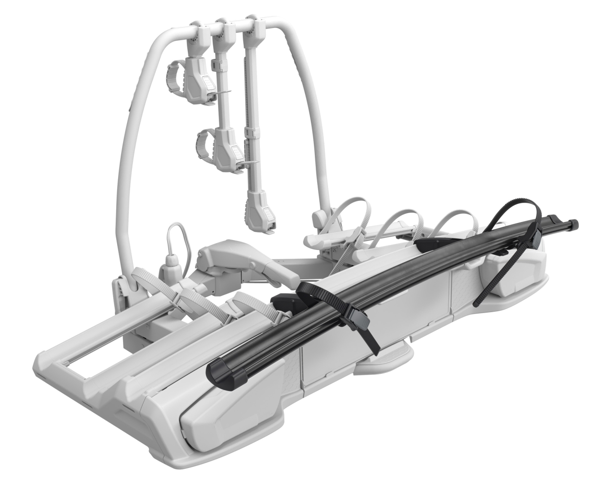 The wheel tray is quick and easy to install and remove thanks to the spring-loaded release buttons. The bike-to-bike arm secures the additional bike frame and has lockable straps that are compatible with Thule One-Key System (lock included).